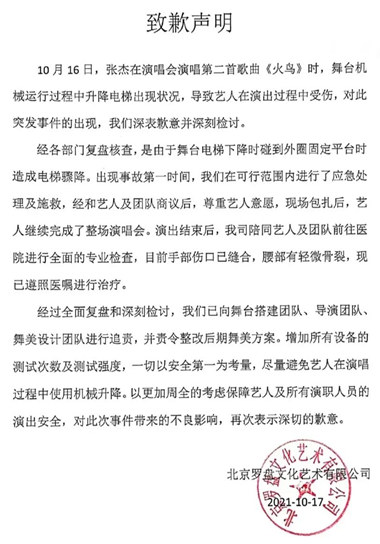 张杰演唱会主办方罗盘文化已发表道歉声明。他们说,事故的原因是在舞台电梯下降过程中,汽车遇到外圈固定平台,导致电梯失速急剧下降,张杰在汽车内被悬挂,导致意外伤害。