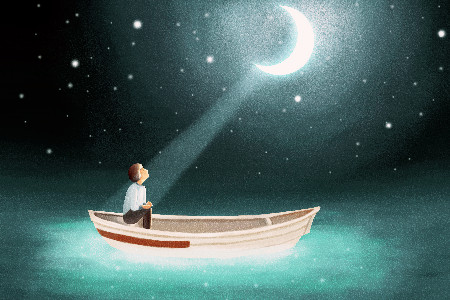 烟青色的枝叶在夜风中微微颤抖,暮色像墨色的缎子,略带褶皱,轻浮的卷云游过夜海,悄悄抚平。淡月就像一艘船,摇摇晃晃地在深蓝色的云锦里,溅着月牙的白光晕笼罩着船,拖着即将摇坠的星星。